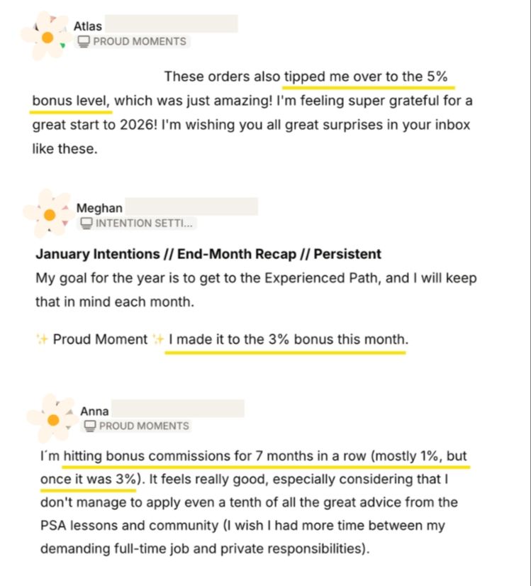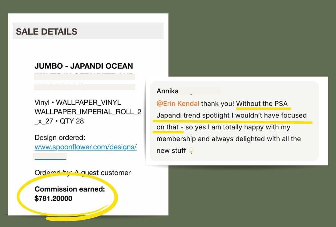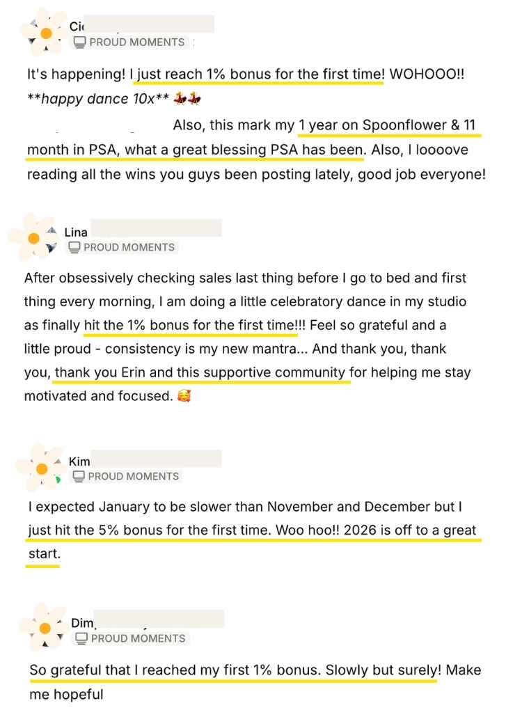 Through our practical lessons, actionable steps, and supportive community, members have achieved milestones like hitting Spoonflower’s bonus commission thresholds for the first time, landing large wallpaper and fabric orders, and growing their shops with steady progress.